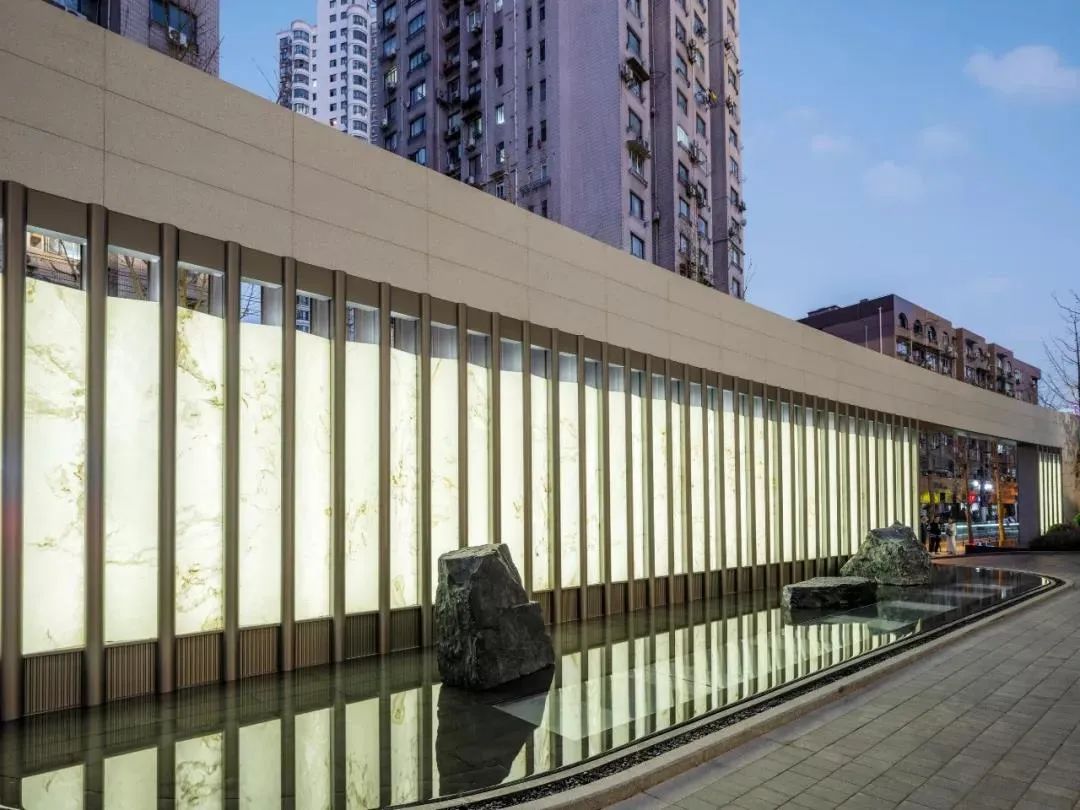 在“萬科 中輿路一號oriental one”示范區(qū)中,運用了另一種超薄石材——透光超薄石材,石材的拼貼營造出精致的景觀效果。